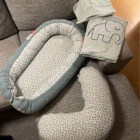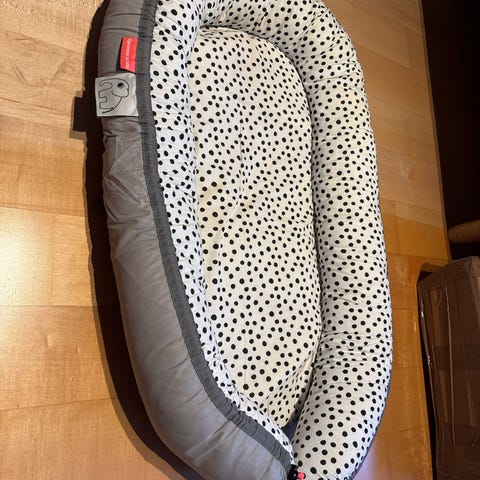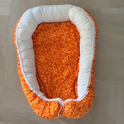 Done by Deer babynest i rosa ton med mönstrad ovansida. Mjukt vadderade kanter ger en ombonad plats för spädbarn att vila eller sova i. Babynestet kan användas i spjälsäng, på soffa eller annan plan yta under uppsikt av vuxen. Yttermaterial och stoppning är anpassade för små barn och ger stöd runt barnet. Använd max 3ggr då vi haft den som extra på stugan, som nytt