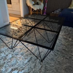 Design Letters soffbord i vitt med bordsskiva i glas. Bordet har dekorativa metall- eller trädetaljer under glasskivan och profilerade ben samt en nedre hylla för extra avlastningsyta. Passar som soffbord eller vardagsrumsbord i hemmiljö.