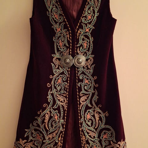 Okänt märke kaftan set i tyll för dam i storlek M. Setet består av en svart, rikt dekorerad jacka/kaftan med flerfärgade broderier och pärldetaljer samt en rosa lång kaftan med matchande broderier längs framkant och ärmslut. Flerfärgad design med inslag av bland annat rosa, blått och guld. Plaggen är avsedda för dam och passar vid högtider eller andra tillfällen där man önskar en traditionell, festbetonad klädsel.