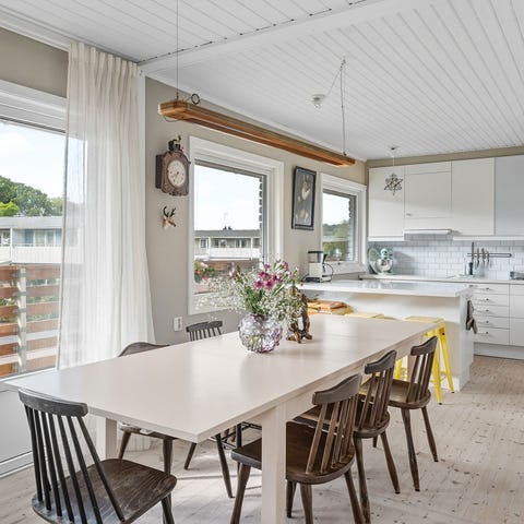 Arkitektritat vackert och minimalistiskt matbord av massiv ask, behandlad med matt vitpigmenterad hårdvaxolja, tillverkat av svenskt möbelsnickeri, L 220, B 100, H 72cm. Skivans tjocklek är 4 cm. Perfekt skick.