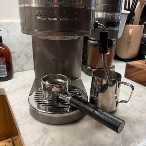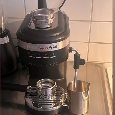 KitchenAid espressomaskin och kaffekvarn i svart utförande. Espressomaskinen har ångstav för mjölkskumning samt avtagbart droppgaller. Till maskinen följer flera filterkorgar, portafilter, tamper och mjölkkanna i metall. Kaffekvarnen är elektrisk med bönbehållare upptill och justerbar malningsgrad, anpassad för espresso och andra bryggmetoder.