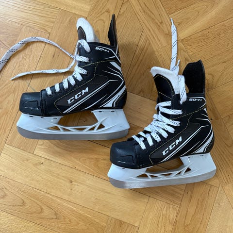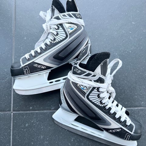 CCM 01 ishockeyskridskor i storlek 37. Färgkombination svart och grå med vita skosnören. Skridskorna har hård yttersko för stöd runt fotleden och klassiska stålskenor anpassade för ishockey. Passar för åkning på isbana och ishockeyträning eller fritidsåkning. Storleken motsvarar EU 37 enligt märkning på insidan av skridskon.