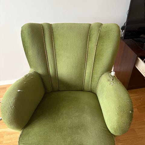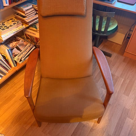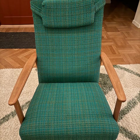 Fåtölj med hög rygg och stoppad sits. Klädd i grönt mönstrat tyg med knappar i ryggstödet. Armstöd och ben i trä med svängd form. Passar som sittmöbel i vardagsrum eller läshörna.