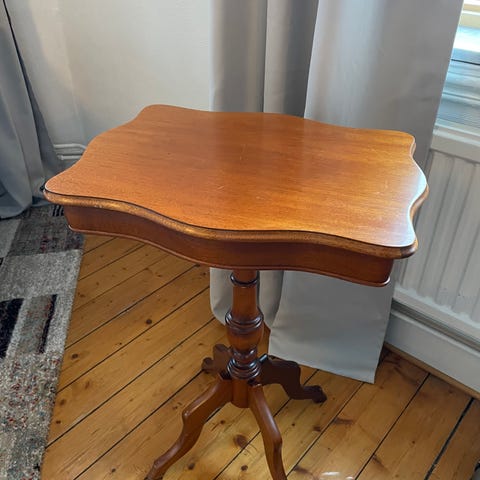 Spelbord i nyrokokostilfrån slutet av 1800-talet eller början av 1900-talet. Det har karaktäristiska svängda ben och en fäll- och vridbar bordsskiva som döljer ett underliggande förvaringsutrymme, vilket är typiskt för denna typ av möbel. Materialet är i teak och mahogny.