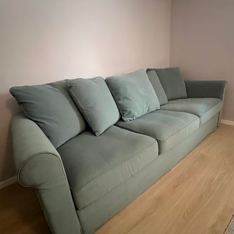 Ljusgrön soffa, märket Fogia, inköpt på Svenssons i Lammhult.