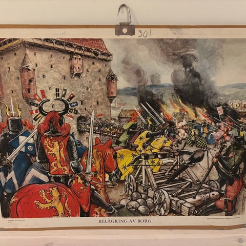 Skolplansch med motivet "Stockholms hamn på Vasatiden". Ett hörn något trasigt. Se bilder. Mått: 86 x 62 cm. Kan hämtas i Fruängen, södra Stockholm, eller tas till Norrköping/Linköping eller Örnsköldsvik med viss fördröjning..
