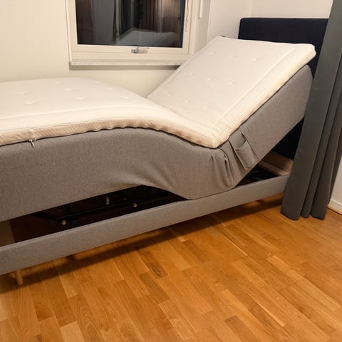 Ställbar säng med två separata madrasser i grått tyg med vita bäddmadrasser. Sängen har justerbar huvud- och fotända som styrs med fjärrkontroller, två fjärrkontroller syns på bilderna. Passar som dubbelsäng eller två enkelsängar i sovrum eller gästrum. Säljas pga flytt. 3000kr st eller 5000kr för båda. Köpte för 40 000kr för 6 år sen.