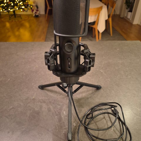 Blue Yeti mikrofon med USB‑anslutning i svart färg. Mikrofonen står på ett justerbart bordsstativ och har reglage för mute, volym och förstärkning på framsidan samt val av upptagningsmönster på baksidan. Levereras med USB‑kabel för anslutning till dator eller annan kompatibel enhet. Lämplig för exempelvis inspelning av tal, podd, gaming, streaming eller videomöten.