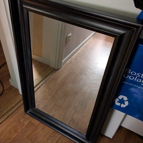 spegel med dekorativ ram. Spegeln har en markerad ram med utsmyckade hörn i klassisk stil. Passar för upphängning på vägg i exempelvis hall, sovrum eller vardagsrum. Kan användas både som praktisk spegel och som inredningsdetalj.