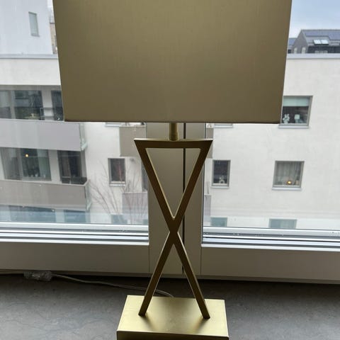 IKEA Torsbo bordslampa. Lampan har en rektangulär tygskärm och en fot i borstad metall. Den ger ett spritt ljus. Strömbrytare finns på sladden. Lampan använder en E14-sockel och har en maximal effekt på 8.6W.