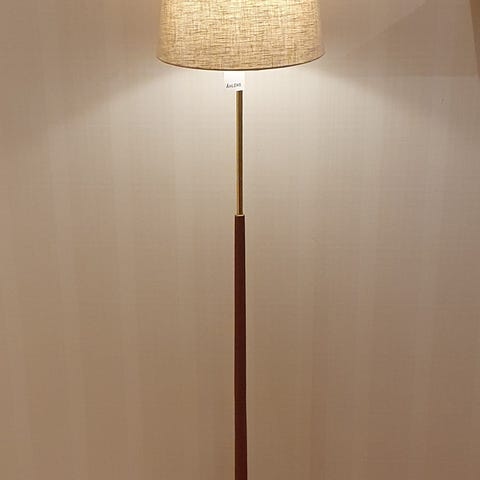 Charmig golvlampa med cylindrisk skärm från 60-talet i vävt naturmaterial, orange-brun nuanserat. Lampfoten är tillverkad av ljust svarvat trä, med rund metallbas i gråfärg.