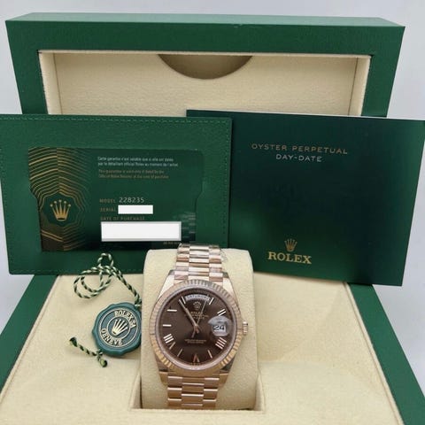 Vi säljer en mycket fin Rolex Day-Date 36 med champagne och diamant-urtavla.