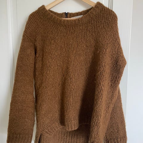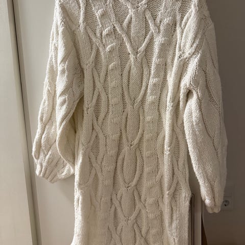 Anna Field tröja för dam i storlek M. Stickad modell i beige ull med polokrage och vid, poncholiknande passform. Tröjan har ribbstickning upptill och mönsterstickning med flätor och rombformade partier nedtill. Passar som varm överdel vid vardagsbruk och lager-på-lager under kallare dagar.
