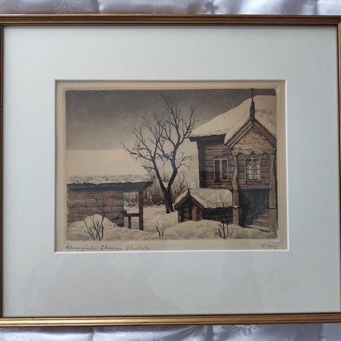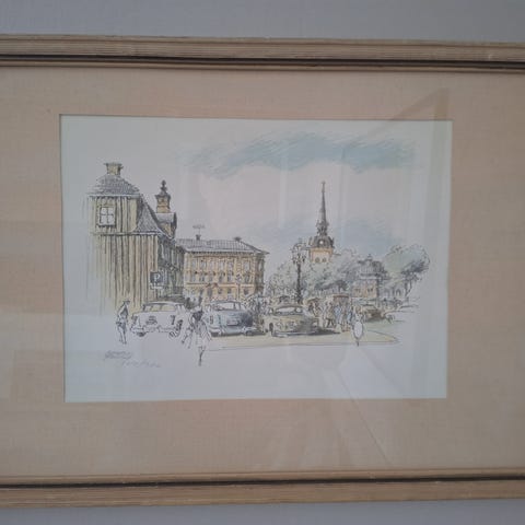 Bortskänkes stor litografi Faaborg Fyn klocktornet 1981