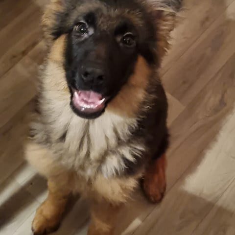 En trevlig och snäll blandrastik , gråhund/ schäfer, född 23/7- 25. Vaccinerad och chippad. Van att åka bil.