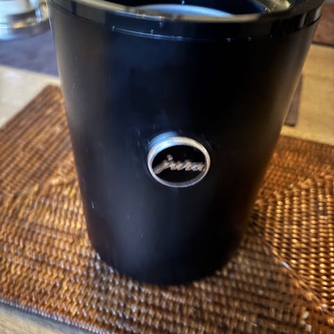 Nespresso mjölkskummare i svart färg. Elektrisk mjölkskummare för att värma och skumma mjölk till kaffe- och espressodrycker. Cylindrisk modell med lock och rostfri kant upptill. Passar för användning i hemmet för att göra cappuccino, latte och andra kaffedrycker med mjölkskum.