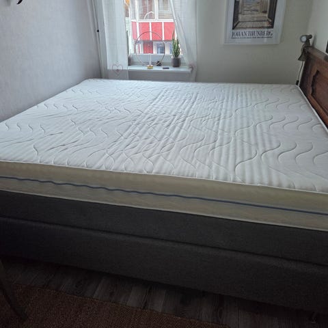 Väldigt skön säng säljes utan bäddmadrass. Några fläckar på madrassen men går att tvätta bort. Ena sidan är soft och andra sidan är medium. Hämtas i Stigslund, snabb affär kan gå ner i pris.