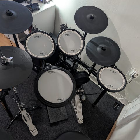En trum-pad lite trasig, men fungerar. Jag är inget proffs på trummor men har testat och det går att spela.