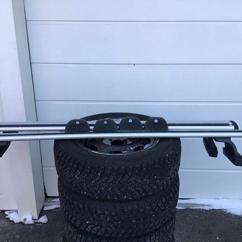 Klassiska fyrkantsprofiler i stål med ytskikt av svart polymer, längd 120 cm. Mångsidig lasthållarfot för fordon med integrerad fästpunkt eller takrelingar. En av lasthållarfötterna har en lägre bas, passar som mittbåge på min Peugeot Partner som har plats för tre lastbågar och ett tak som är något välvd. Den fjärde medföljer som reserv. Inga nycklar finns till lasthållarfötterna. Två är nya och saknar lås i modellen, de andra två är äldre och har lås men öppnas med skruvmejsel då de saknar nycklar. Det nya paret 1500 kr och det äldre paret 1200 kr. Eller 2500 kr tillsammans.
