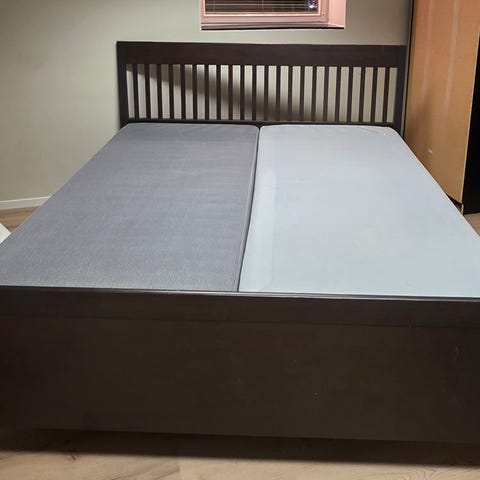 Begagnad, men i mycket bra skick. Skruvas i sängramen, se bild 3. Hos oss hamnar den högt p.g.a. höga ben till sängen. Jag har bara 3 bultar så de behöver kompletteras om ni tänker använda den som ben (har aldrig provat, men det ser ut att gå).