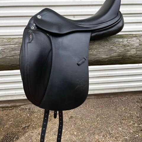 Skön svart dressyrsadel. 17’, normal vidd och ganska rak modell.