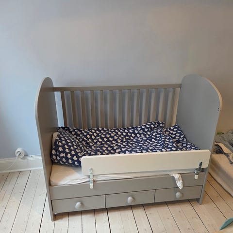 Spjälsängen har använts som extrasäng och är därför väldigt lite använd.