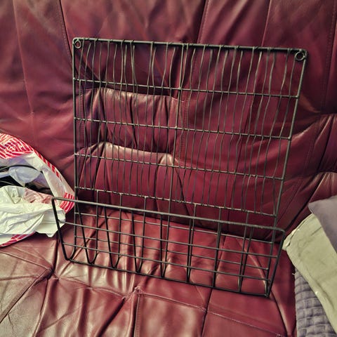 En tidningskorg som monteras på väggen , tung , vit, trä. Robust.