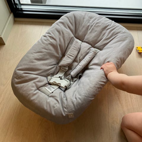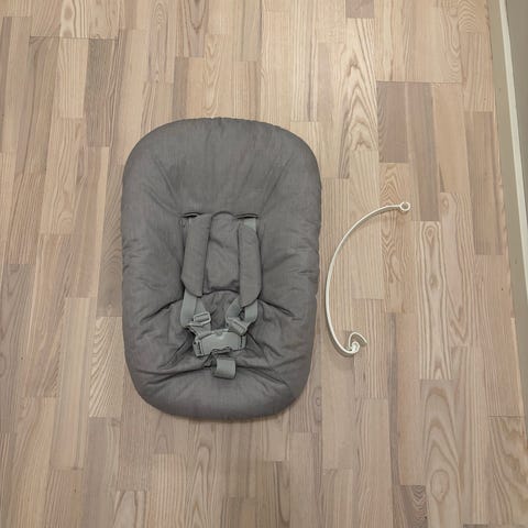 Stokke Tripp Trapp Newborn set i grå textil med integrerat säkerhetsbälte. Babysitsen är avsedd att användas tillsammans med Stokke barnstol och ger ett liggande/sittande läge för spädbarn. Undersidan är i hård plast med ventilationsöppningar och fästen för montering på stolen. Passar för inomhusbruk som extra sitt- och viloplats för mindre barn.