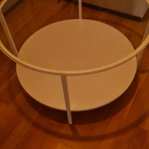 Ikea soffbord med rund glasskiva och tillhörande svarta sittpuffar. Bordsskivan är i glas och vilar på en mittdel med metallfärgade fästen. Under bordet finns fyra separata sittpuffar i svart klädsel som kan skjutas in under bordet när de inte används. Passar som soffbord eller litet matbord i vardagsrum eller mindre utrymmen.