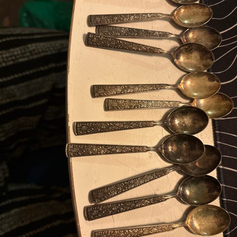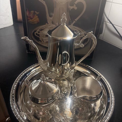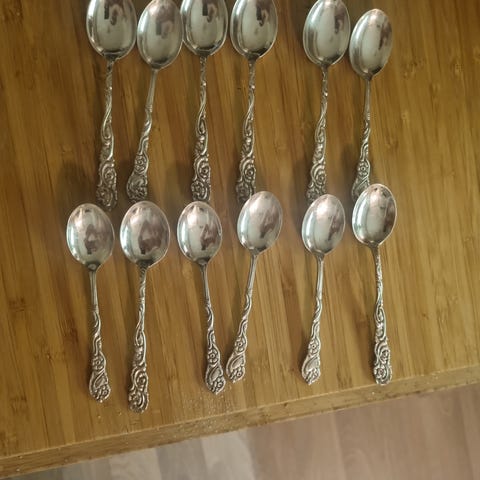Bestickset med sex dekorativa skedar i silver metall. Skedarna har rundade, lätt skålformade skedblad med mönstrad yta och skaft med figurliknande dekorationer upptill. Levereras i ask med röd satininredning. Lämpliga som teskedar eller serverskedar vid exempelvis kaffe eller dessert. I orginal etui.