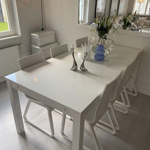Matsalsbord i gustaviansk stil, 4 stolar, 2 iläggsskivor.