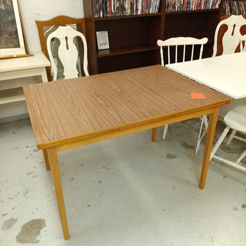 Matsalsbord, 4 stolar, 2 iläggsskivor och hörnskåp