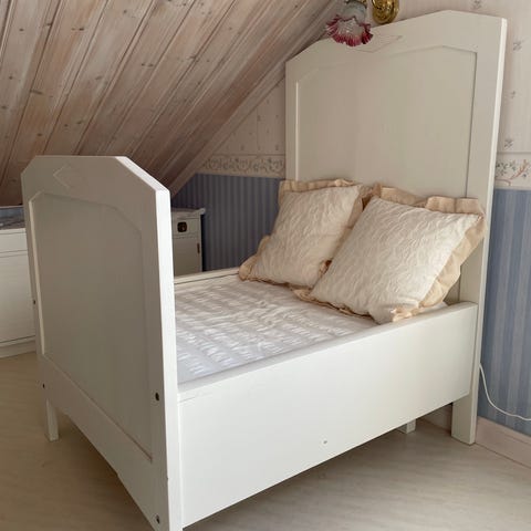 Bra skick för att vara en äldre säng. Färgen vi målat med har hållt bra, endast lite färgskav på något ställe. Ribbotten som ej är målad.