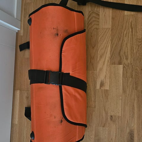 Liggdel med ljus insida och dragkedjor på sidorna där det finns handtag för att kunna bära liggdelen.