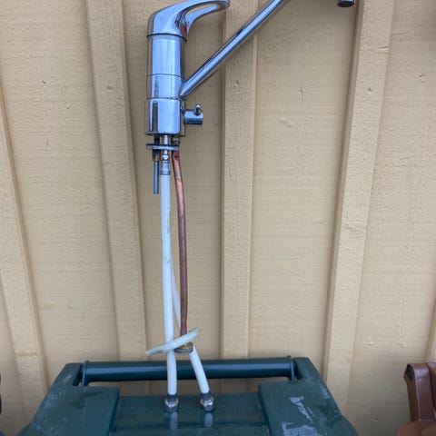 5 stycken anslutningsslangar som används vid en våtrumsrenovering, där duschkabinen flyttades ut till ett annat rum under renoveringsperioden.