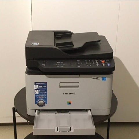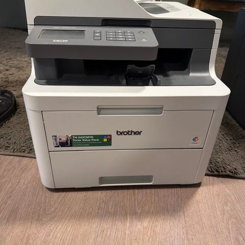 Färg: ljus med mörkblå panel. Lämplig för kontorsmiljö eller andra verksamheter med behov av en större multifunktionsskrivare.