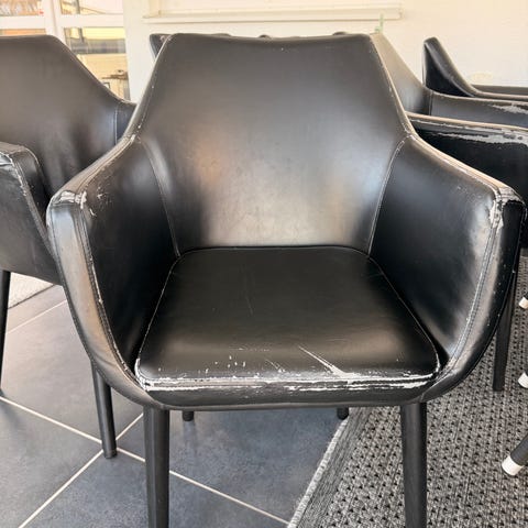 6 stycken stolar, bra skick i dyna/rygg/ställning. Konstlädret slitet på armstödet.