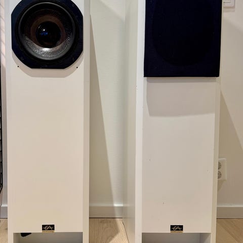 Canton golvhögtalare GLE490 i vitt utförande. Modellen är ett par höga högtalare med flera element på framsidan, anpassade för placering på golv. Passar för användning i hemmabio eller stereoanläggning där man önskar fristående högtalare med neutral design i ljus färg.