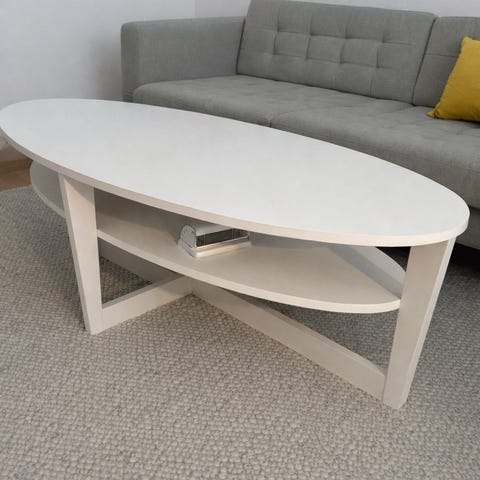 Mio soffbord i vitt utförande. Bordet är avlångt/ellipsformat med rundade kanter och har en övre bordsskiva samt ett underliggande hyllplan för förvaring av till exempel tidningar, fjärrkontroller eller mindre föremål. Bordet står på fyra runda ben i samma färg som skivorna. Passar som soffbord i vardagsrum eller tv-rum.