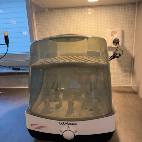Sterilisator till nappflaskor, bröstpump och napp. Den översta delen kan användas i mikrovågsugn för snabbare sterilisering. Hämtas i Rosendal.