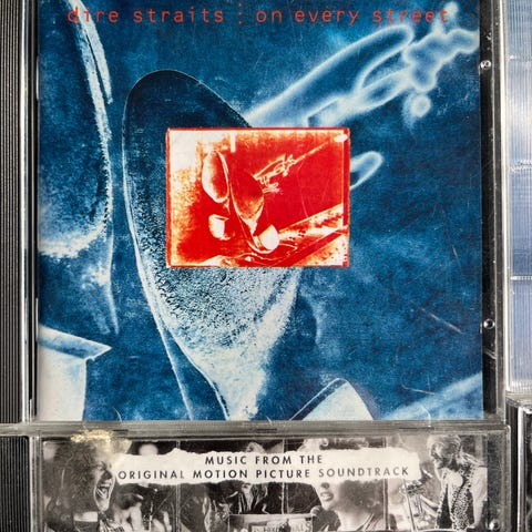 Samling med vinylskivor av blandade artister inom rock. Flera olika albumomslag och utgåvor syns på bilden. Passar för den som samlar på eller lyssnar på rock på vinyl. Spelbara på standard skivspelare för vinyl.