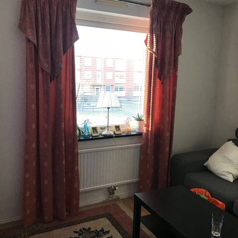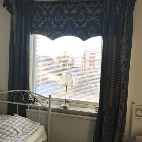 Gardinlängder och tillhörande band. Materialet är slätt tyg i en enhetlig färgton. Fin rosé färg.