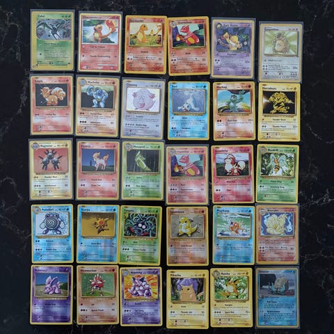 En större samling pokemonkort med många äldre/vintage kort. Olika årgångar och skick.
