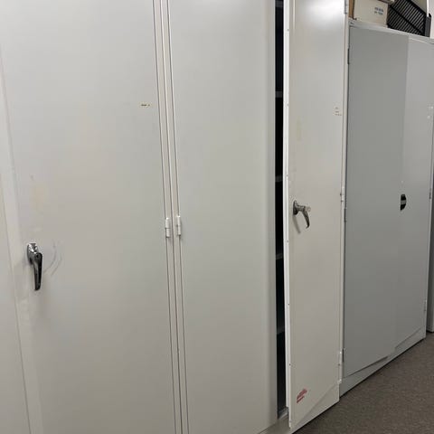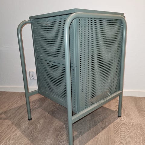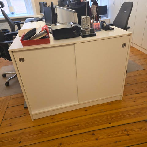 Skänk med förvaring. Ca 2m x 75 cm. Topp klädd i ”sammet”. Underrede i blank, kromad metall med slät, reflekterande yta. Passar kontor eller allmänna ytor. Finns på Södermalm.