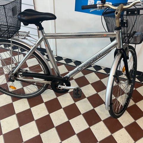 Crescent hybridcykel för unisex med ramstorlek M/L och 28" hjul. Cykeln har en orange och silverfärgad ram, rakt styre med Nexen växelreglage och en bred, svart sadel för upprätt och bekväm sittställning. Hybridcykeltypen passar för vardagscykling i stadsmiljö och på lättare grusvägar. Storleken M/L är anpassad för vuxna användare.