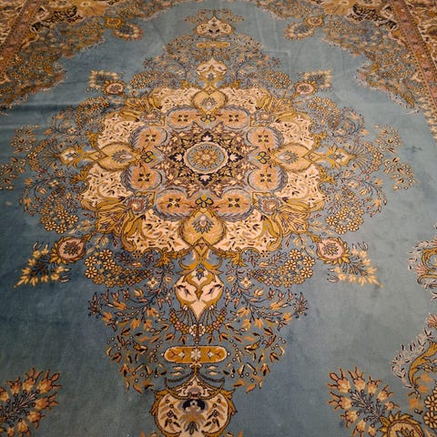 Orientalisk matta med detaljerat jakt- och naturmotiv i flerfärgat mönster. Rektangulär form med bred bård runt om och symmetriskt placerade figurer och ornament i mittenfältet. Passar som golvmatta i vardagsrum, matsal eller annat större rum där ett dekorativt textilt inslag önskas.
