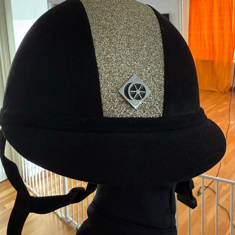 Svart sammetshjälm med strass på framsidan. Extra stenar följer med.