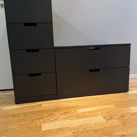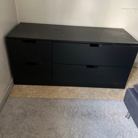 En nordli byrå i antracit med 4 lådor. Använts som TV-bänk. Små märken på en av lådorna men annars i väldigt bra skick.