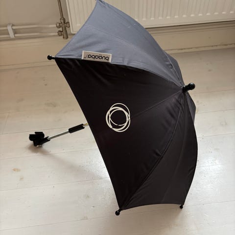 Bugaboo parasoll till barnvagn i beige tyg med solskydd +50. Parasollen har justerbart skaft och fäste för montering på barnvagnens chassi. Passar som solskydd vid promenader och kan vinklas efter behov. Jag har haft den på min Bugaboo Buffalo men kan byta fästen för olika chassi.