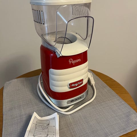 Champion popcornmaskin i bänkmodell i röd och vit färg. Maskinen har en transparent frontlucka och inbyggd gryta för poppning av popcorn. Avsedd för användning inomhus, exempelvis i kök eller vardagsrum. Passar för tillagning av popcorn vid filmkvällar eller andra tillfällen där man vill göra popcorn hemma.